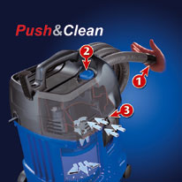 Tecnologia Push&Clean aspirazione costante senza cali di potenza. Con questo sistema è sufficente bloccare l'entrata dell'aria dal tubo di aspirazione e premere il tasto di pulizia del filtro.
