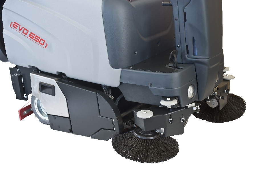Il modello EVO 650 è una lavasciuga spazzante " uomo a bordo " che si differenzia dalle attuali macchine in produzione in quanto, a parità di condizioni, utilizza il 50% di acqua in meno e quindi, proporzionalmente, il 50% di detergente in meno impiegato da tutte le altre lavasciuga / lavasciuga spazzanti; infatti, anche nelle curve più strette e senza l'ausilio di tergi laterali non c'è la minima dispersione della soluzione pulente; la soluzione erogata  entra sempre a contatto il gruppo spazzante lavante, ottimizzandole l'utilizzo; raccoglie grandi quantità di detriti  grazie ad un cassetto di dimensioni. Filtraggio assoluto: Non necessitaq di filtri d'aspirazione della polvere in quanto, l'azione del gruppo spazzante è preceduta dai getti d'acqua e/o detergente.
